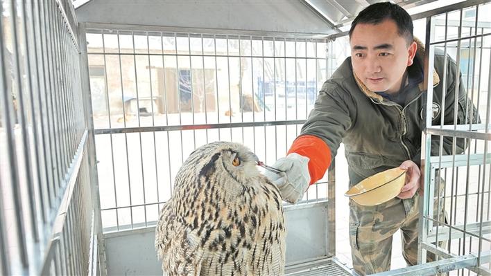 1月5日,郭世军在救助站内给受伤的国家二级保护动物长耳鸮投喂食物。 杜仪 朱小丽 摄